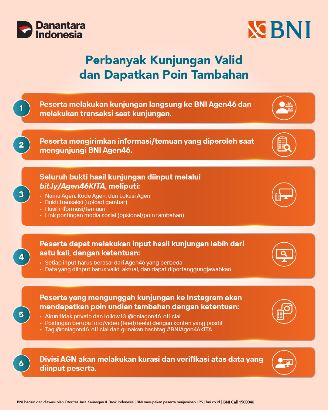 Yuk, ambil bagian dalam program ini, dukung Agen46 di sekitar kita, dan bersama-sama wujudkan layanan BNI yang semakin dekat, relevan, dan berdampak. Informasi lebih lanjut dapat mengunjungi bni.id/agen46-kita.